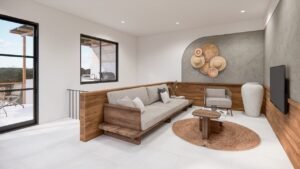 Modern Mediterranean architecture with clean lines and natural textures.